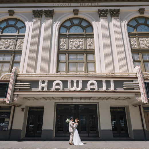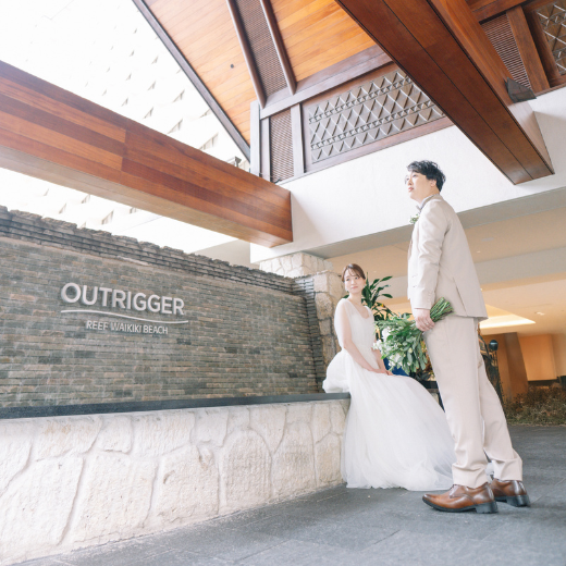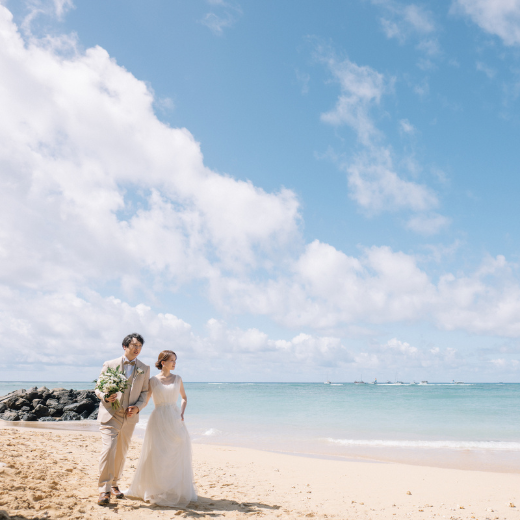 海が綺麗な場所でウェディングフォトを撮りたいという思いがあり、その理想に一番近かったのがハワイだったからです。 年間を通して気候が安定しており、晴れの日が多い点や湿度が高くない点が魅力的でした。 美しい海と過ごしやすい気候の中で特別な一日を迎えることができるハワイが、私たちにとって最適な場所でした。