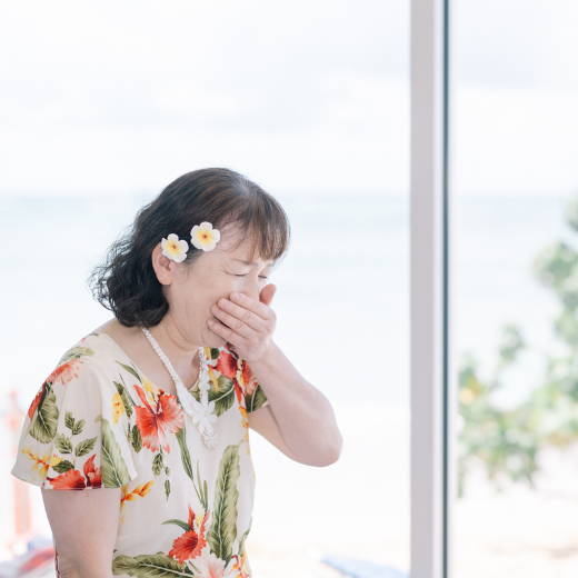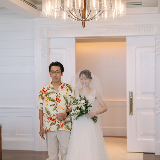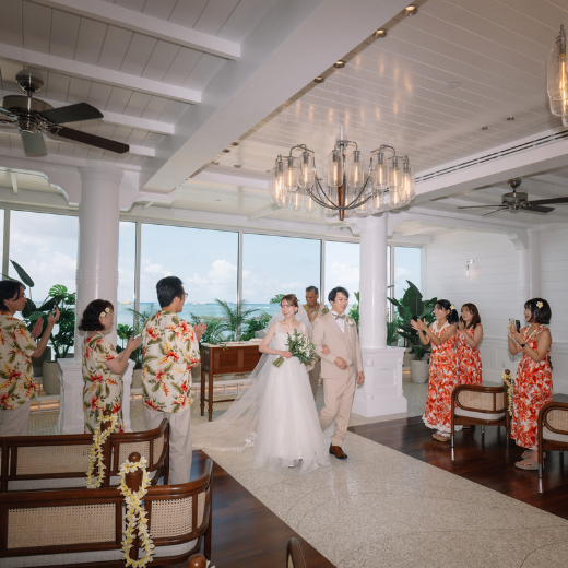 新郎新婦が揃った後、牧師さんの進行でみんなで声を合わせて「ALOHA」と言った瞬間が特に心に残っています。 私たちや参列者みんなが笑顔になり、緊張が一気にほぐれて温かい空気に包まれた時間でした。