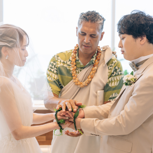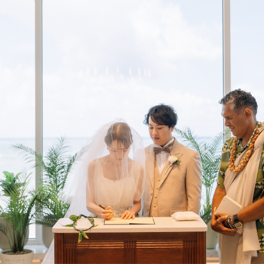 演奏や牧師さんの笛の音色がとてもハワイらしく、日本国内ではできない貴重な体験ができてよかったです。 誓いの言葉が英語だったのも新鮮で印象深かったです。 全体的に堅苦しさがなく、とてもフラットでリラックスできる雰囲気のセレモニーでした。
